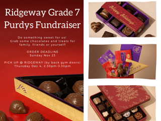 Ridgeway Grade 7 FundraiserDo something sweet for us! Grab some chocolates and treats for family, friends or yourself! ORDER DEADLINE Sunday Nov 23 PICK UP Thursday Dec 4, 2:30pm-3:30pm @ RIDGEWAY (by back gym doors) |