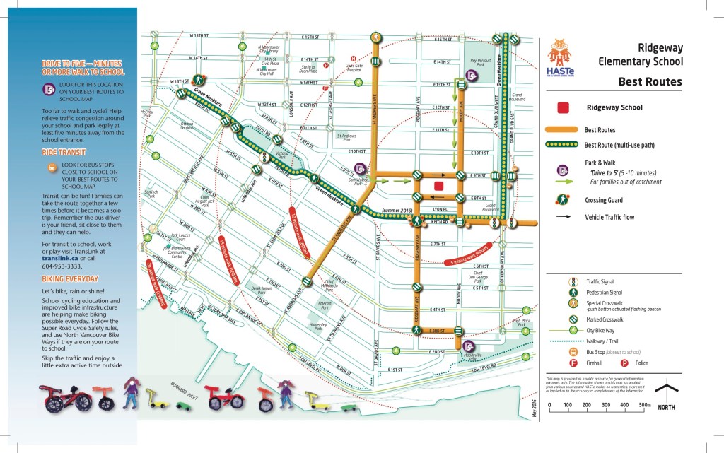 With a growing student population and general traffic pressures increasing in North Vancouver, there have been growing concerns from parents and neighbourhood residents around traffic, parking, and pedestrian safety. There have been several studies of traffic in the Ridgeway area. A Safe Routes to School guide was developed (below), as well as some improvements to sidewalks and crosswalks. In 2019/2020, the City of North Vancouver consulted with Ridgeway parents, students, and neighbours on a School Zone Safety Review and has developed a new action plan.
